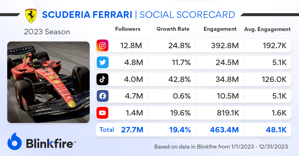 In 2023, Ferrari concluded the year with an impressive surge, garnering 4.5 million new followers. The bulk of this influx flocked from Instagram, totaling 2.5 million, while TikTok contributed a substantial 1.2 million. Moreover, Ferrari distinguished itself as the team with the highest overall engagement, boasting remarkable interaction rates per post on Instagram, with an average engagement of 192,000.