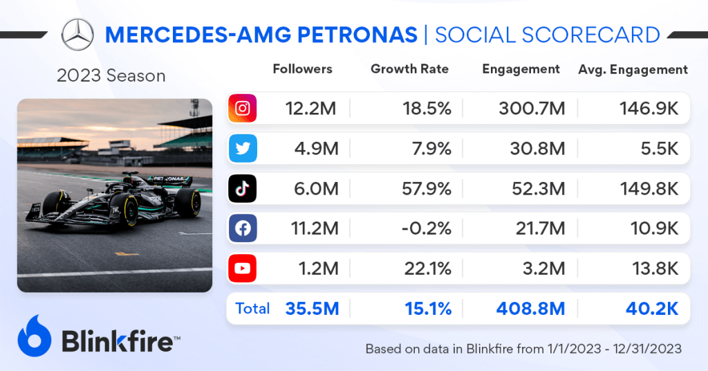 Red Bull’s 2023 is unbeatable: constructor’s championship and first and second place in the drivers’ standings. Their total growth of social media followers was 17.9%, with a notable surge in TikTok followers, increasing by 109% with 2.4 million new followers. Red Bull achieved impressive figures on short video platforms, particularly in views, averaging 1.1 million per post.