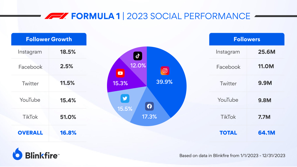 Mercedes is the team with the largest social media fanbase across the entire grid. During 2023, their fanbase increased by nearly five million followers, with an impressive 83.7% coming from TikTok (2.2 million) and Instagram (1.9 million). This growth not only highlights Mercedes’ popularity but also underscores the undeniable appeal of video-centric platforms among sports enthusiasts.