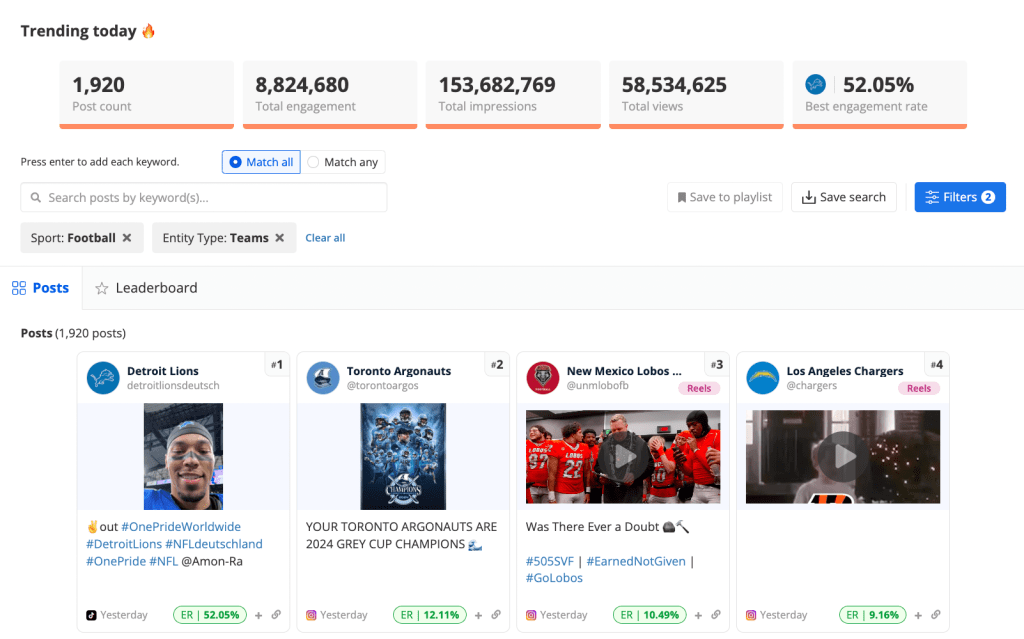 Blinkfire Trends makes content discovery and tracking seamless. The platform is designed to save time and streamline workflow, allowing users to dive into meaningful metrics without sifting through a sea of data. With quick-search filters, social media managers can refine results based on network, sport, media type, key performance indicators (KPIs), and even specific keywords related to topics, hashtags, or events. This efficiency means more time to strategize and create compelling content, rather than getting lost in endless searches.